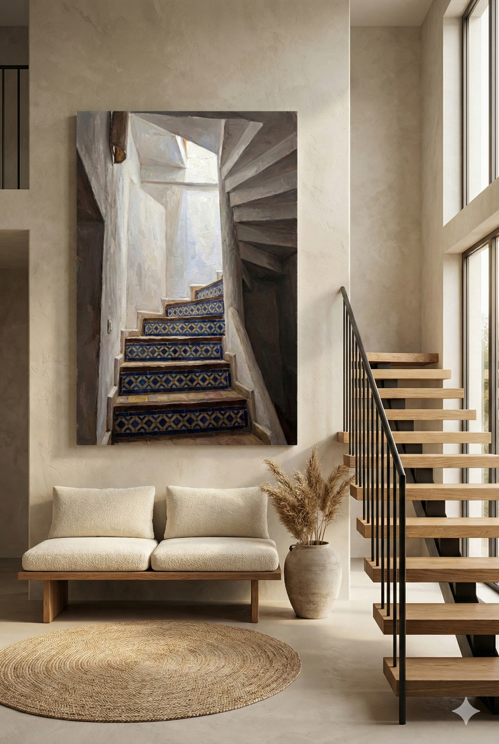 A captivating architectural painting of a narrow Moroccan spiral staircase with zellige tile risers in alternating blue patterns. This dynamic artwork draws the eye upward through the mesmerizing geometry of traditional stairway design.